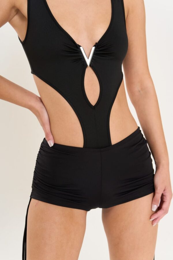 Body strapless de tela Milano de brillos con fruncidos detalle para efecto hourglass