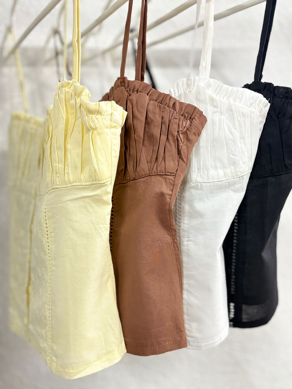 Top de tela microfibra strapless con argolla u y frunce detalle