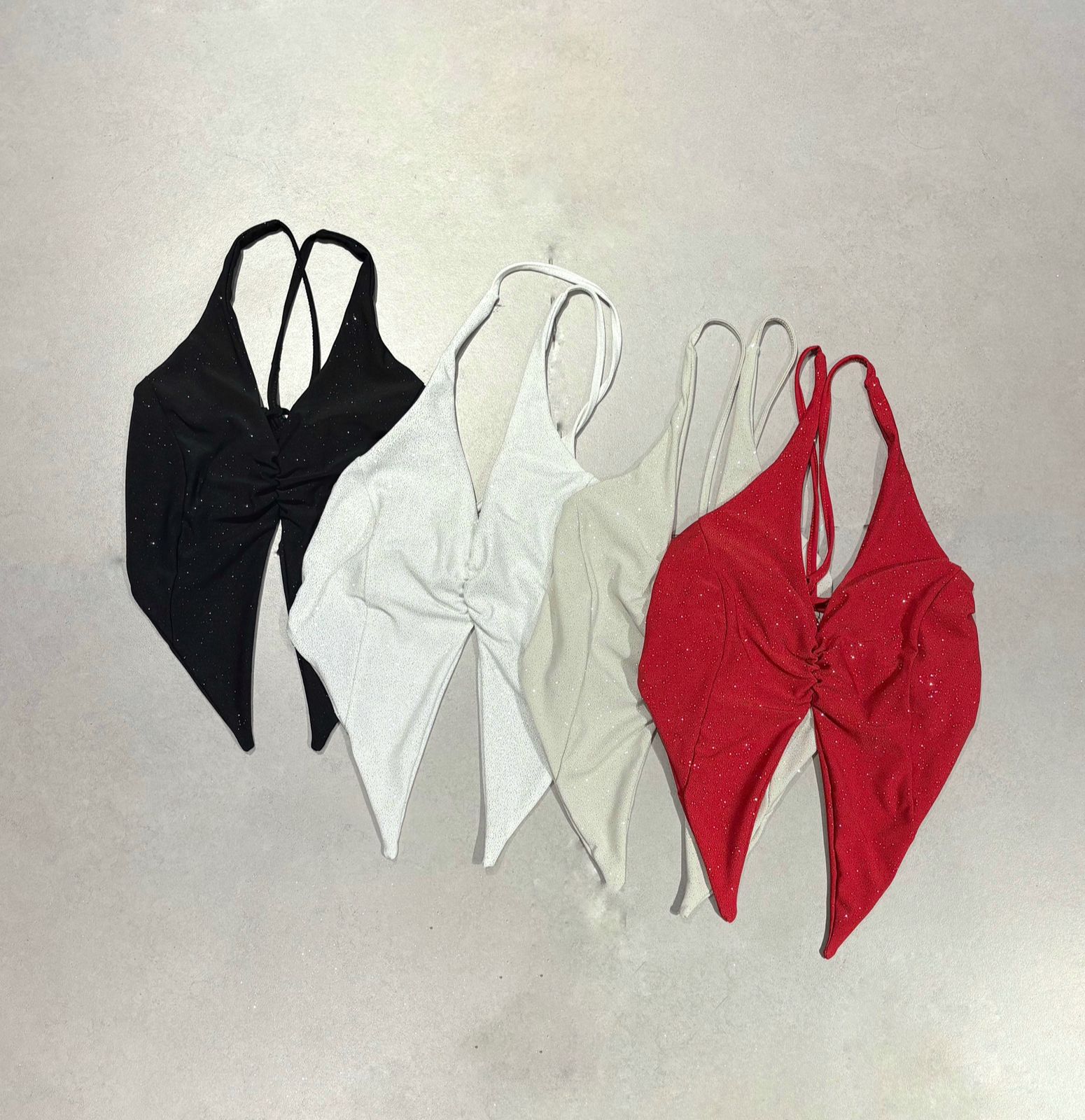 Top de tela brillosa estilo halter mariposa con fruncido detalle