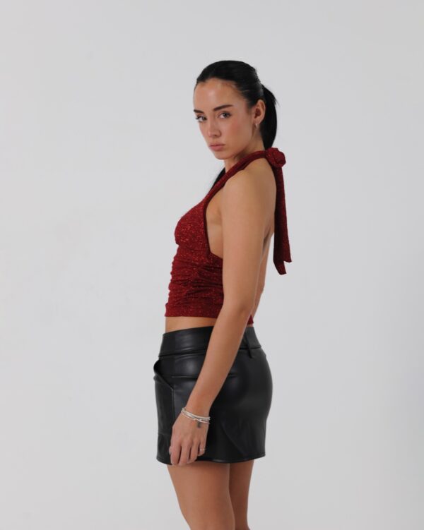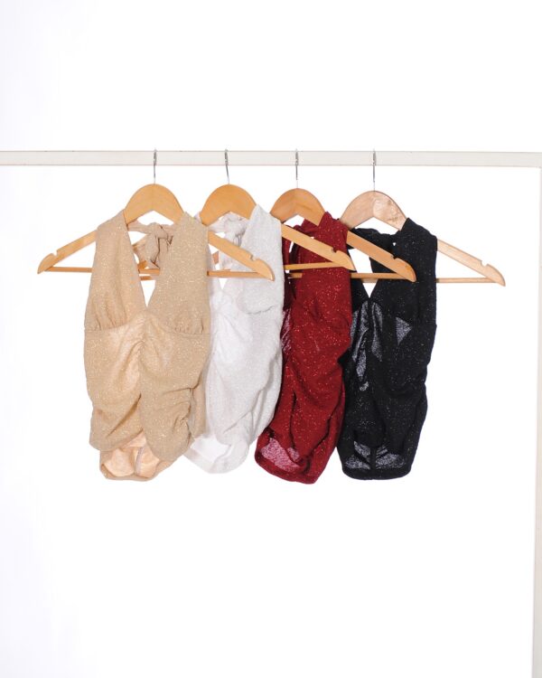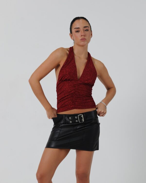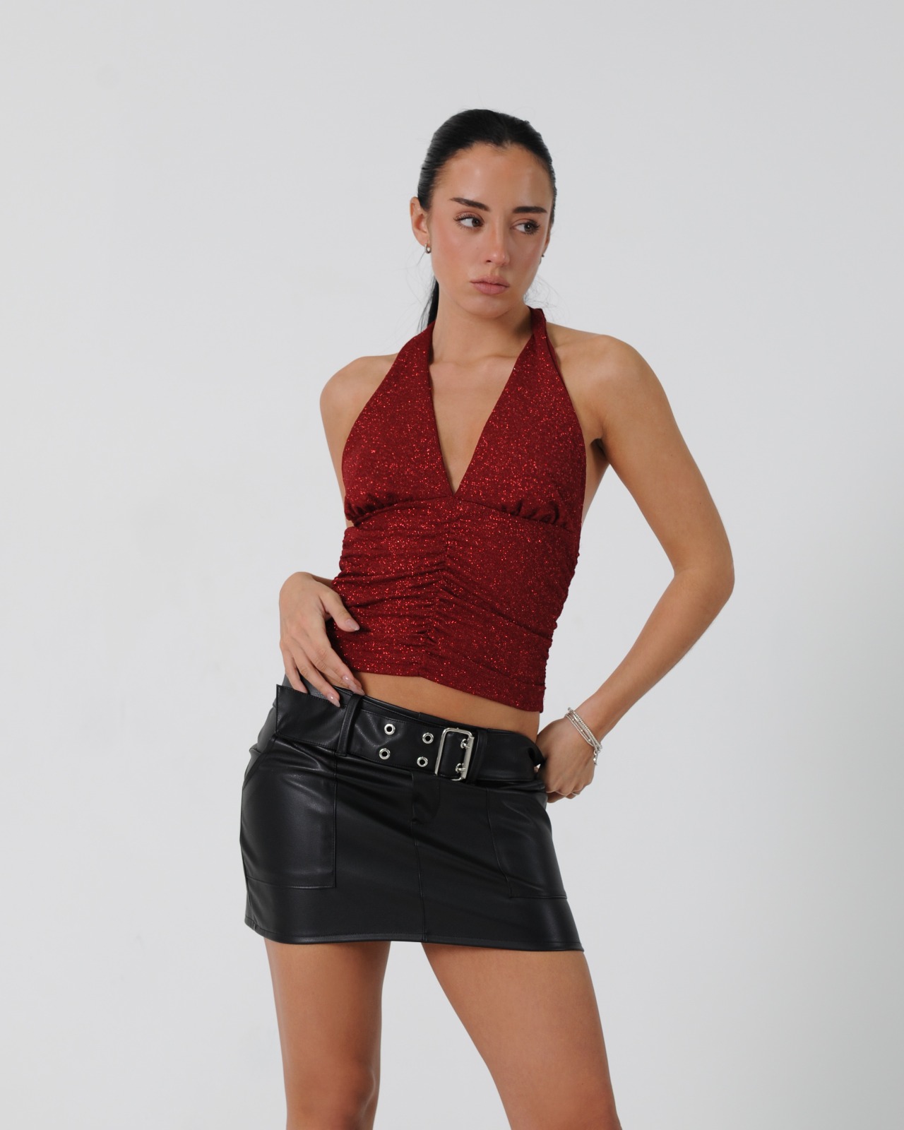 Top de tela Milano brillosa estilo halter con frunce detalle y nudo de cuello