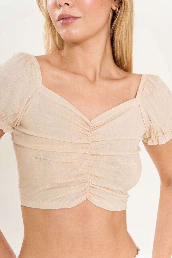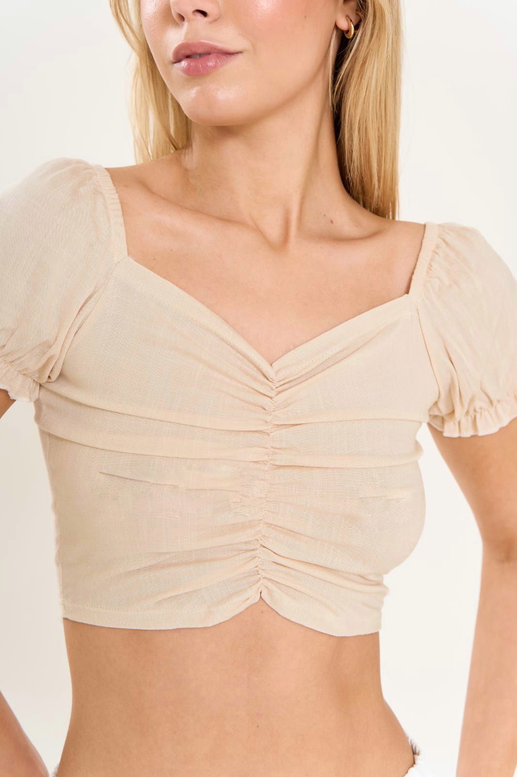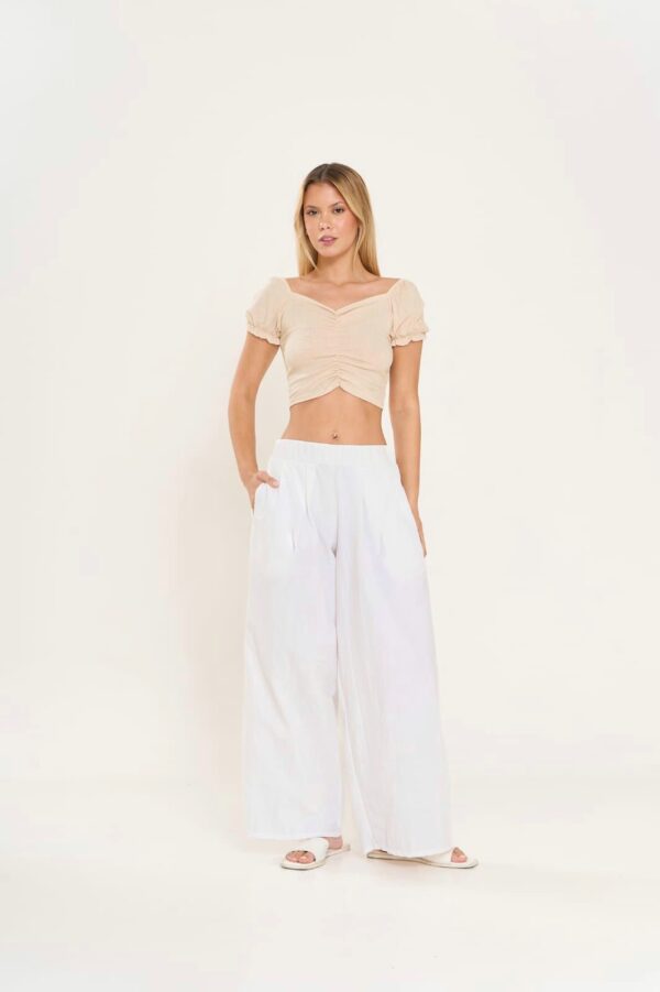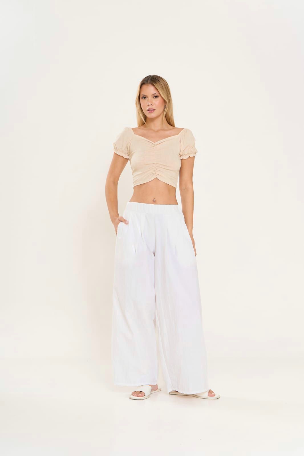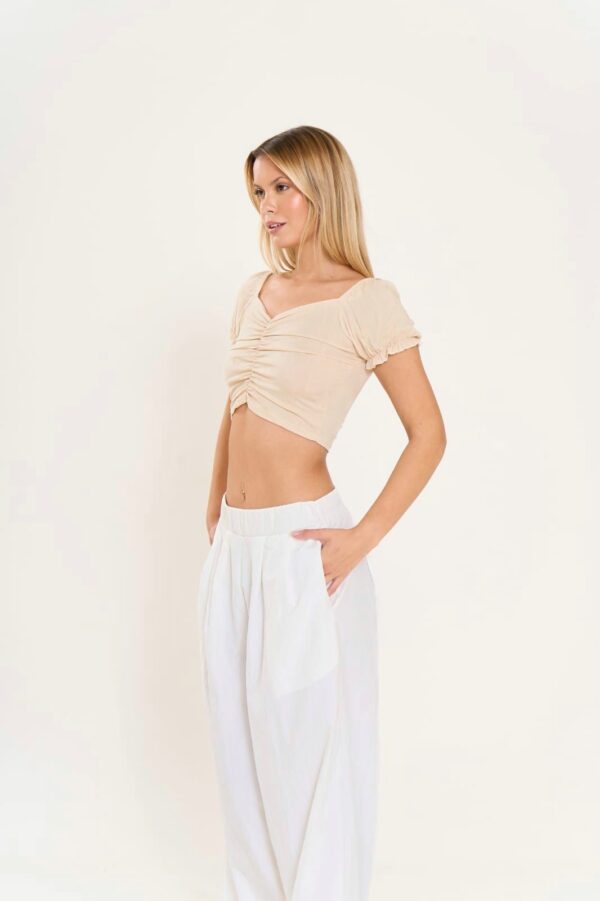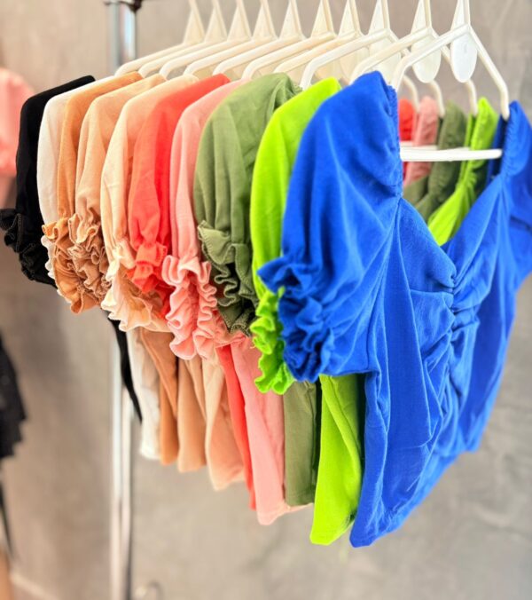 Top de tela Baby Kalm manga larga estilo off shoulder con fruncidos detalle y tajos en los lados